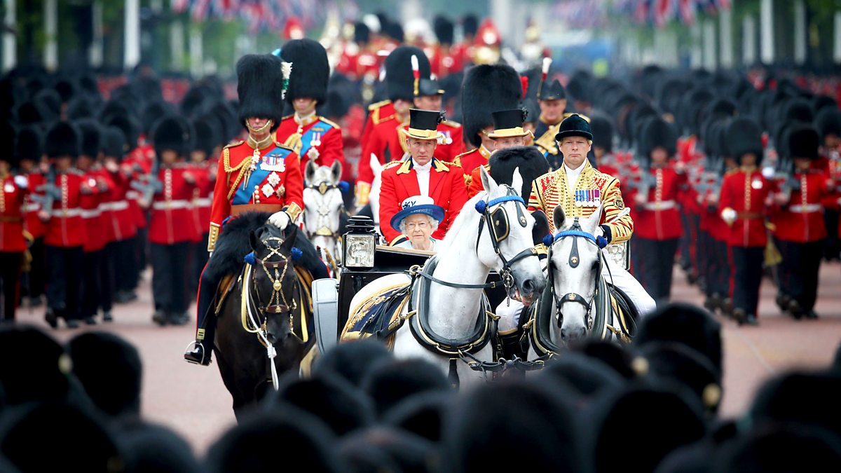 Highlights of the morning's military spectacle from Horse Guards Parade in London, when the Colour of Nijmegen Company, Grenadier Guards was trooped to mark the Sovereign's official birthday. Introduced by Huw Edwards.