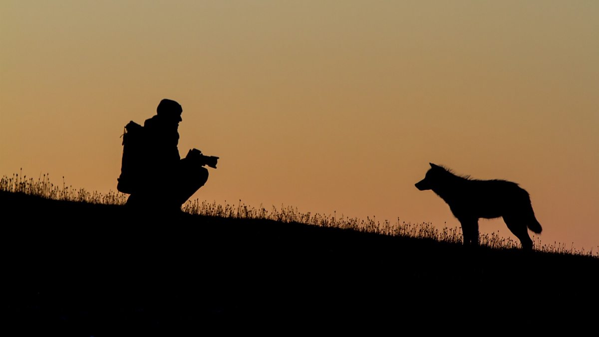 Gordon Buchanan plays fetch with an arctic wolf named Scruffy