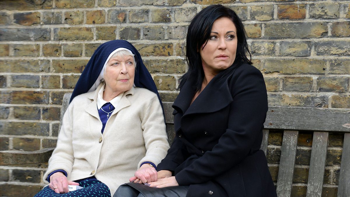 Back downstairs, Sister Judith introduces Kat to Sister Ruth – a nun who would have been a part of the order when Kat came to give birth. Sister Ruth instantly remembers Kat, stating she arrived at the convent with her mum; Viv. As Sister Ruth leads a nervous Kat into her bedroom, Kat remembers that it was where she was brought to have Zoe. Kat informs Sister Ruth of how she struggles to remember what happened – apart from a few flashbacks. As the pair sit outside, Sister Ruth tells Kat that she’s been at the convent for forty years and Kat’s was her last baby delivery. Kat blurts out that she became pregnant from an uncle; she was 13. Back in the store room, Kat tells Sister Ruth that she tried to take her own life again recently, like she did in this room. Kat remembers how she was meant to give birth at her Aunty Vi’s, but her mum brought her here – at that point she wanted out. When Sister Ruth suggests that there must have been someone watching over her, Kat’s unimpressed – God wasn’t there for her when Harry was abusing her.