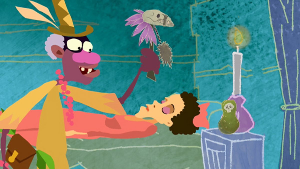 The zombie is in a bad way; she's very sad and is under the control of the witch doctor.