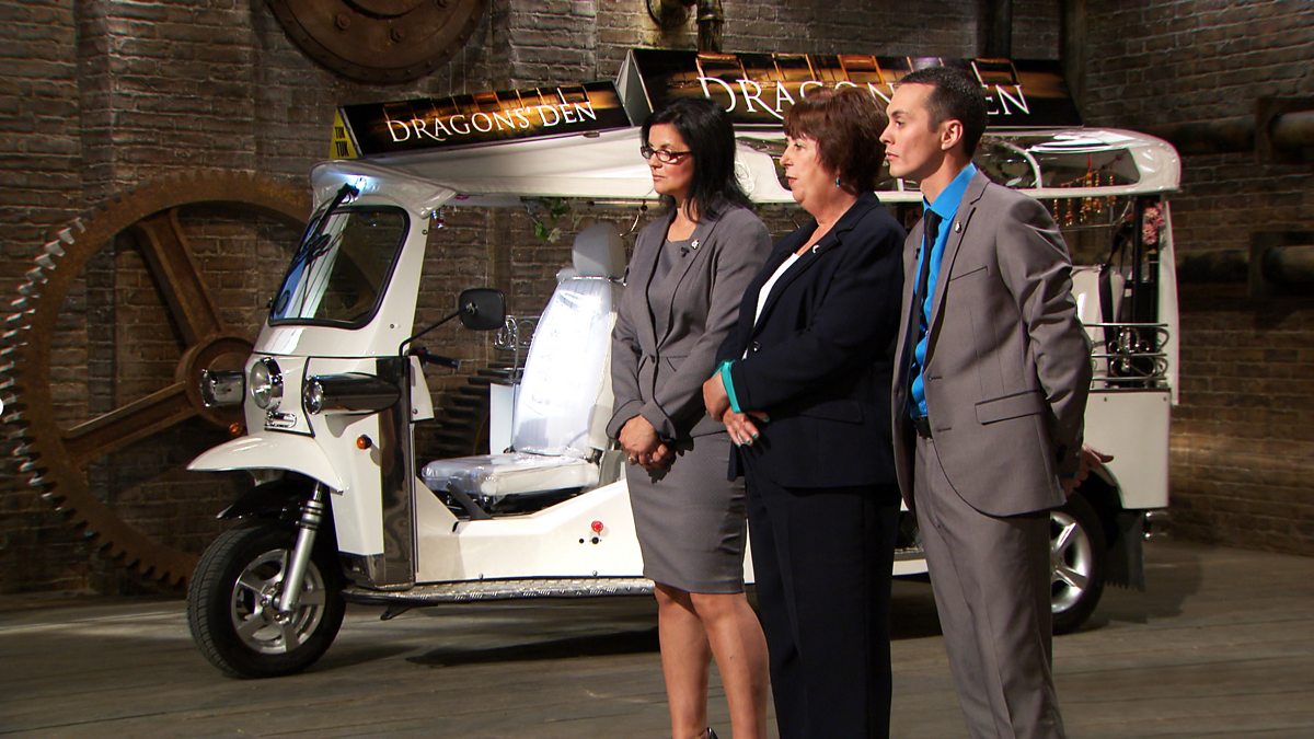 Budding entrepreneurs pitch business ideas to multimillionaires. A husband and wife team from Liverpool take the Dragons on a tour of the Den in their electric tuk tuk.