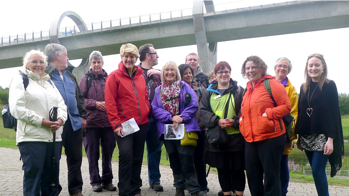 Clare Balding walks along the Forth and Clyde canal to the spectacular Kelpies - 30 metre high statues of horses' heads, modelled on Clydesdales. Walking with her is a group led by Jan Bee Brown - the Reader in Residence at Falkirk Libraries.