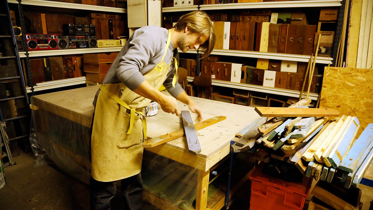 Dress designer Chinelo takes on the challenge of the sofa, turning it into a designer delight. The angle iron is utterly transformed by furniture guru Rupert, and Sarah takes on the writing slope.
