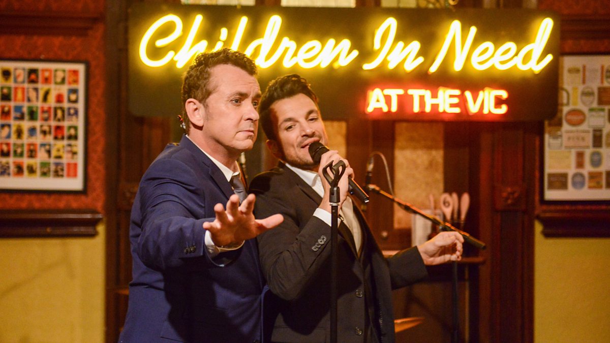 The Children in Need entertainment feast of fundraising switches over to BBC Two - and Walford - where Shane Richie is joined by a host of stars live from the Queen Vic, along with a very special house band led by Peter Andre.