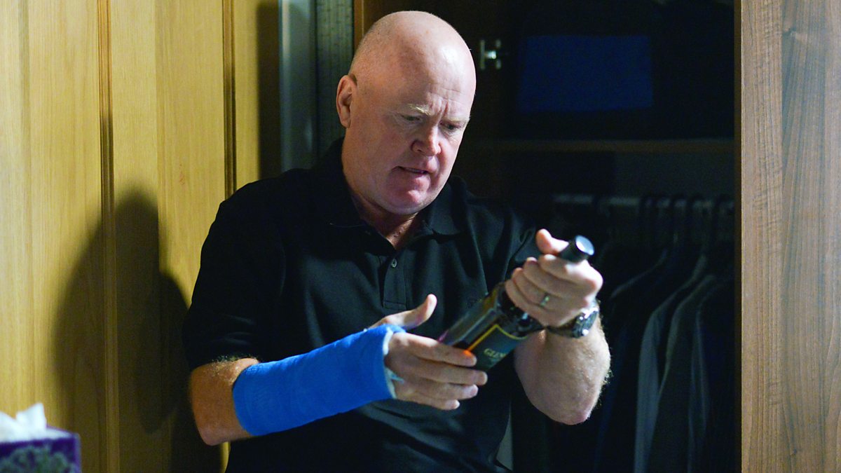 A hungover Phil wakes up and is angered to find he is locked in his bedroom. Phil apologises to Sharon through the door; Sharon maintains that she has to keep him in there to make it stop. A desperate Phil rifles through his wardrobe and finds a bottle of whiskey, wrapped for Ian and Jane. Phil opens the bottle and swigs. Ben, Jay and Abi are unimpressed that Sharon’s locked up Phil, but Sharon stands firm; it’s her husband, her way. Later, Sharon tries bringing Phil some food, but is devastated to find that he’s drunk again. When she tries to snatch the bottle from him, he slaps her hard.