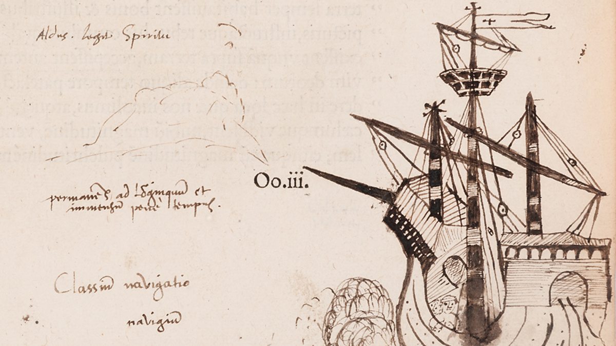 Main Image: Cicero - Opera omnia, vol. 2. Ship drawing in margin and annotations by John Dee. Photograph by Mike Fear. (c) Royal College of Physicians.