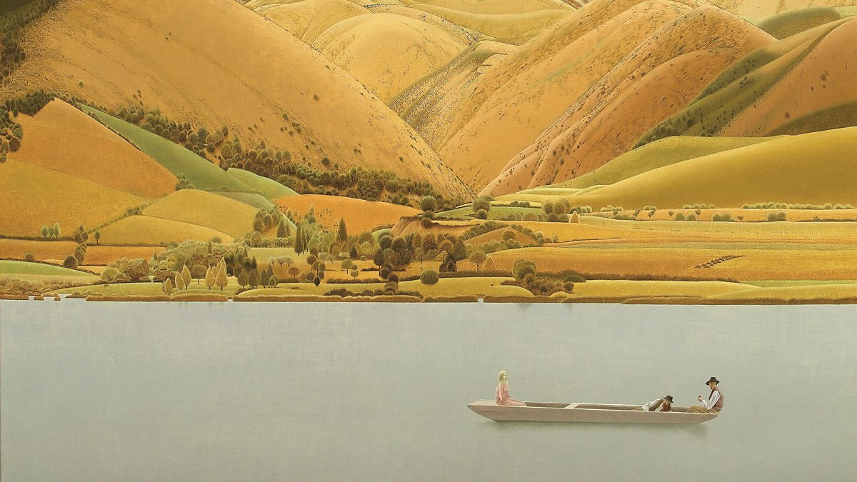 Main image: Winifred Knights, Edge of Abruzzi; boat with three people on a lake, 1924-30, oil on canvas, (detail)