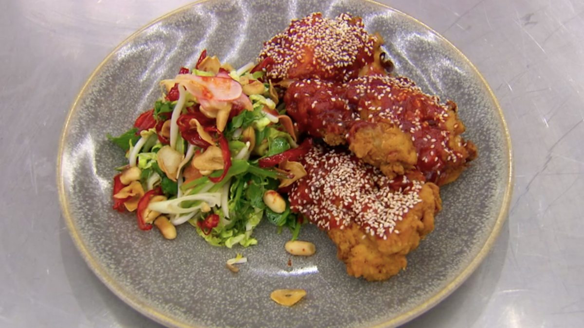 It's Finals Week on Celebrity MasterChef, and the four remaining cooks continue to battle for the Celebrity MasterChef title. The celebrities' first challenge is their most daunting yet - John's Palate Test. John cooks a highly complex dish - Korean fried chicken with Asian salad - which the celebrities have to taste and then identify the ingredients in. They then have one hour and fifteen minutes to recreate the dish themselves.