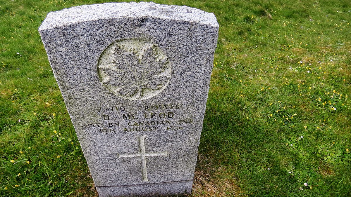Nuair a chaidh dithis air a robh an aon ainm dhan Arm Chanèidianach air an aon là san t-Samhain 1914, 's gun eatorra ach aon àireamh de dh'eadar-dhealachadh san àireamh rèiseamaid aca, cha bhiodh e na iongnadh gur dòcha, rè uine, gun deigheadh mearachd a dhèanamh agus gun deigheadh fiosrachadh mun deidhinn an luib a chèile. Sin a thachair nuair a bhàsaich Dòmhnall Macleòid san Fhraing san Lùnastal 1916. Clunnidh sibh mar a thachair san sgeulachd annasach seo còmhla ri Annella Nicleòid.