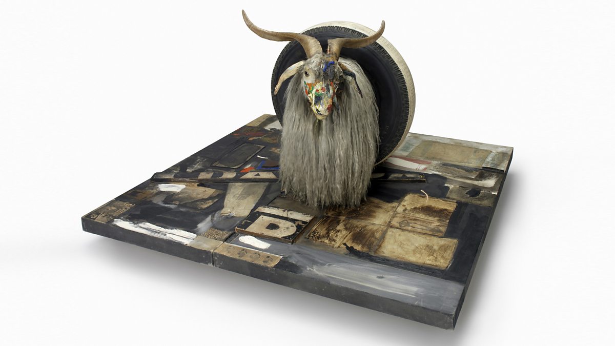 (Image: Monogram, 1955-59. Combine: oil, paper, fabric, printed reproductions, metal, wood, rubber shoe-heel, and tennis ball on two conjoined canvases with oil on taxidermied Angora goat with brass plaque and rubber tire on wood platform mounted on four casters 106.7 x 135.2 x 163.8 cm Moderna Museet, Stockholm. Purchase with contribution from Moderna Museets Vänner/The Friends of Moderna Museet (c) Robert Rauschenberg Foundation, New York).