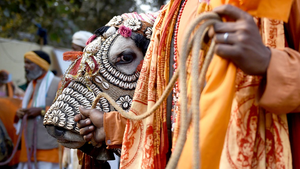 Image: An Indian sadhu (Hindu holy man) holds onto a cow at a protest against their killing. Photo credit: Sajjad Hussain/Getty