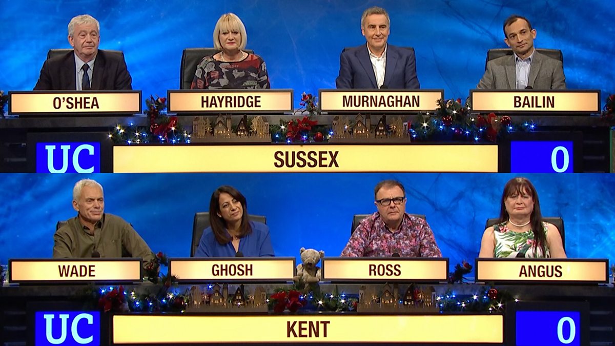 A University of Kent team with presenter Paul Ross and journalist Shiulie Ghosh battles a University of Sussex side featuring news presenter Dermot Murnaghan and comedian Hattie Hayridge for a place in the semi-finals.