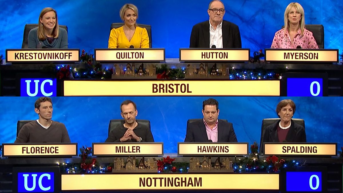 A festive edition of the quiz. In the last first-round match, alumni from the University of Bristol take on a team from Nottingham University.