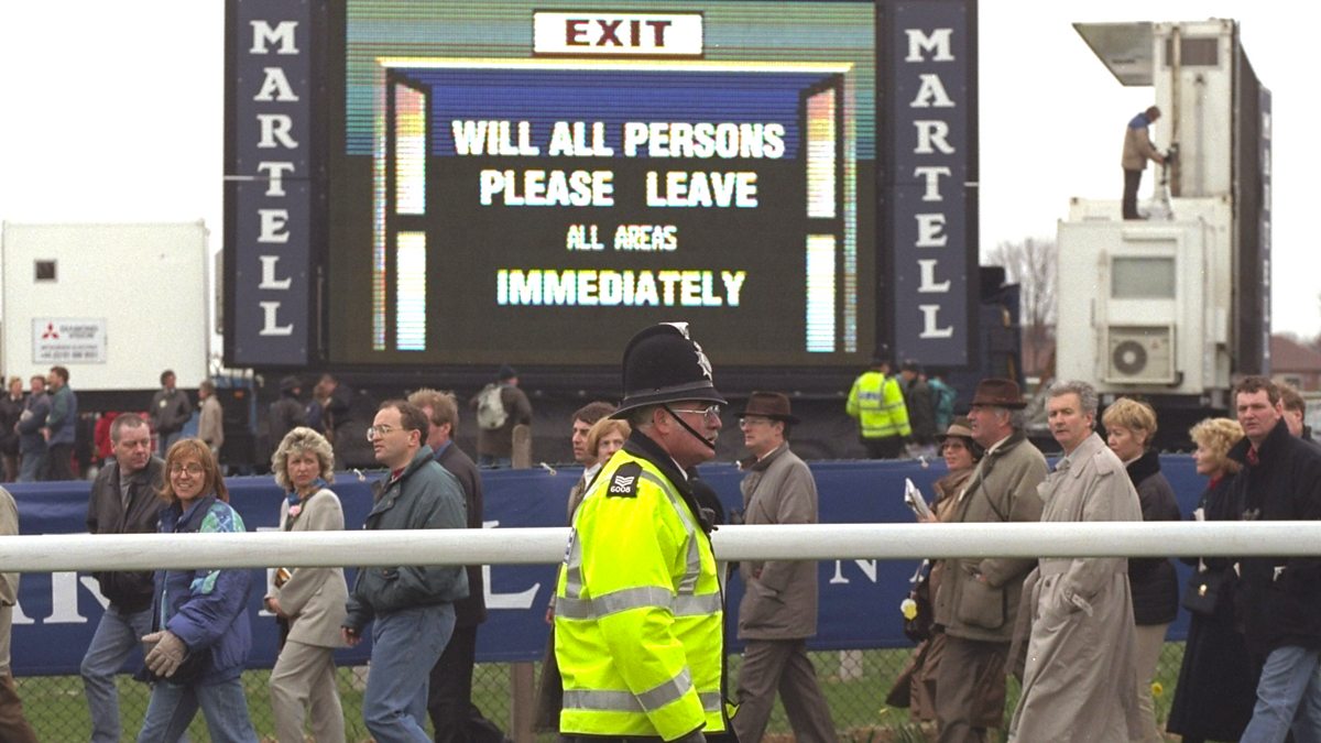60,000 people were hurried away from Aintree as TV viewers witnessed scenes of racegoers clambering over fences trying to escape.