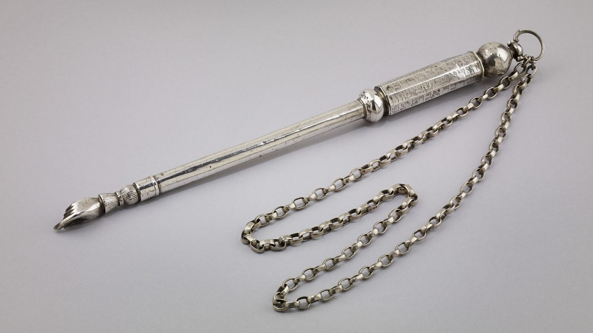 A striking cobalt blue mosque lamp, from around 1570, shows an Islamic way of doing honour to the word: calligraphy. In Jewish religious ceremonies a yad - a small silver rod with a little hand and a pointing index finger - is used to follow the text during readings from the Torah, to avoid any damage to the delicate parchment.