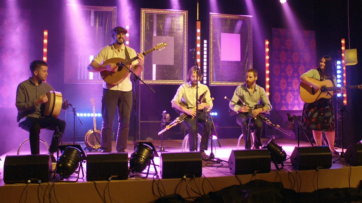 Irish-language magazine show. Máire Bhreathnach and Tomaí Ó Conghaile introduce this week's studio guest, poet Louis de Paor, and there is lively Irish traditional music from Réalta.