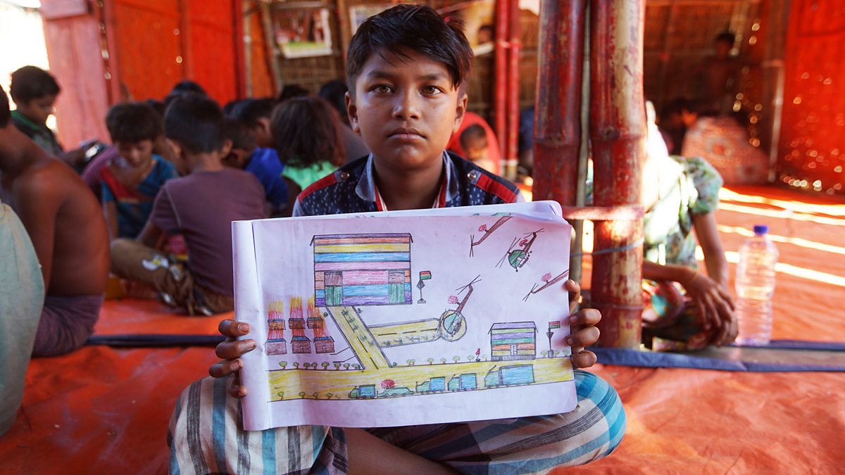 In August 2017, 11-year-old Monzur Ali saw things no child should ever see. Military helicopters landed on the football pitch in his village in Northern Rakhine in Myanmar. 'We didn't really want to leave my village, but there was a lot of shooting. Some people were hanged from trees and shot. The dead bodies were left hanging', Monzur told Panorama. He and his family fled the country and are now living across the border in a giant refugee camp in Bangladesh.