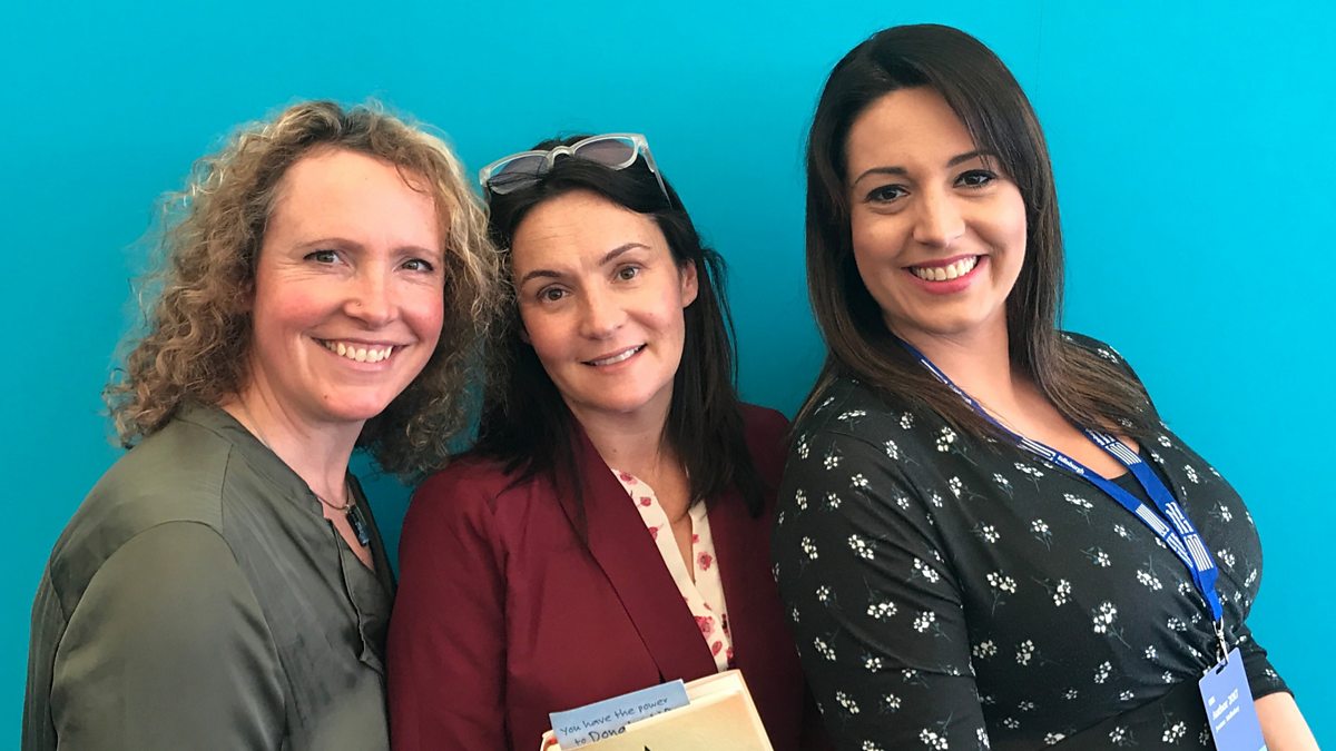 Pennie Latin discusses child tissue donation with mother Sarah Gray and Joanne Mullarkey of the University of Bradford.