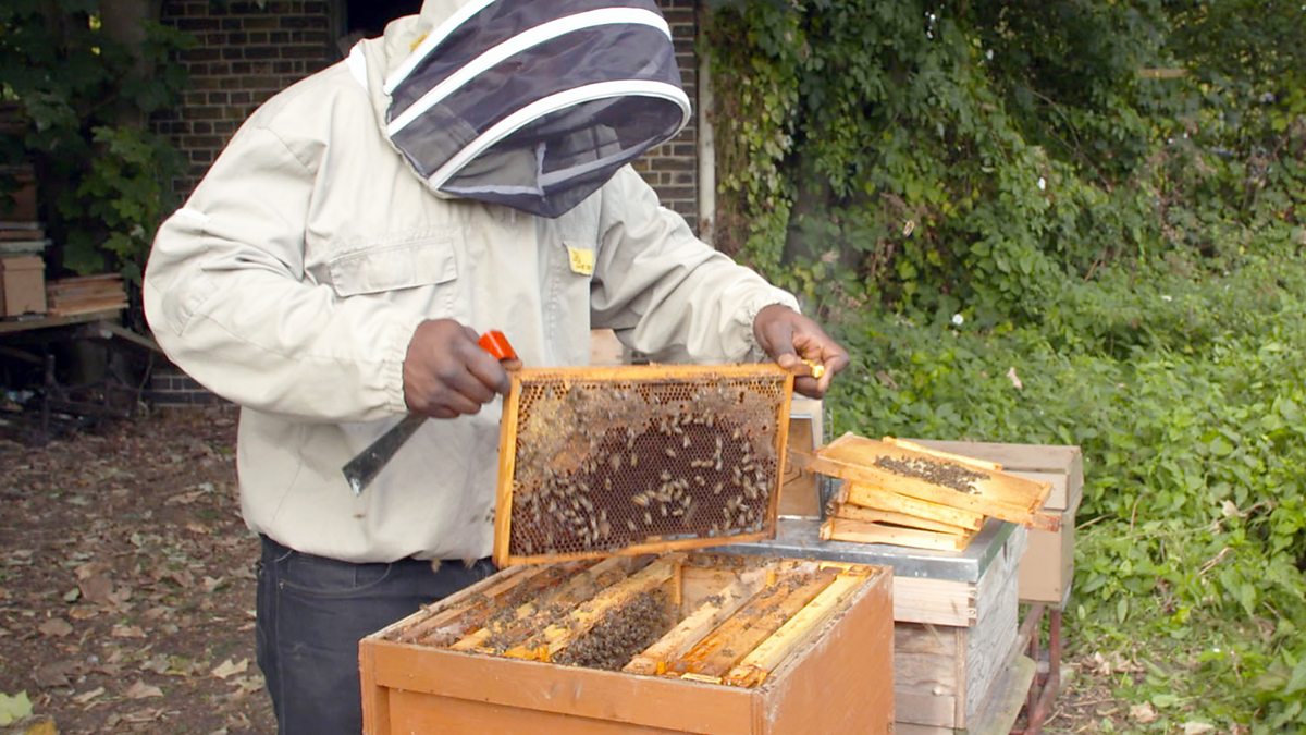 Two produce farmers hope to sell out at London's oldest farmers' Market in Islington - Nigel Dyer, a fruit and veg grower from Cambridgeshire, and London beekeeper Curtis Thompson selling raw honey.