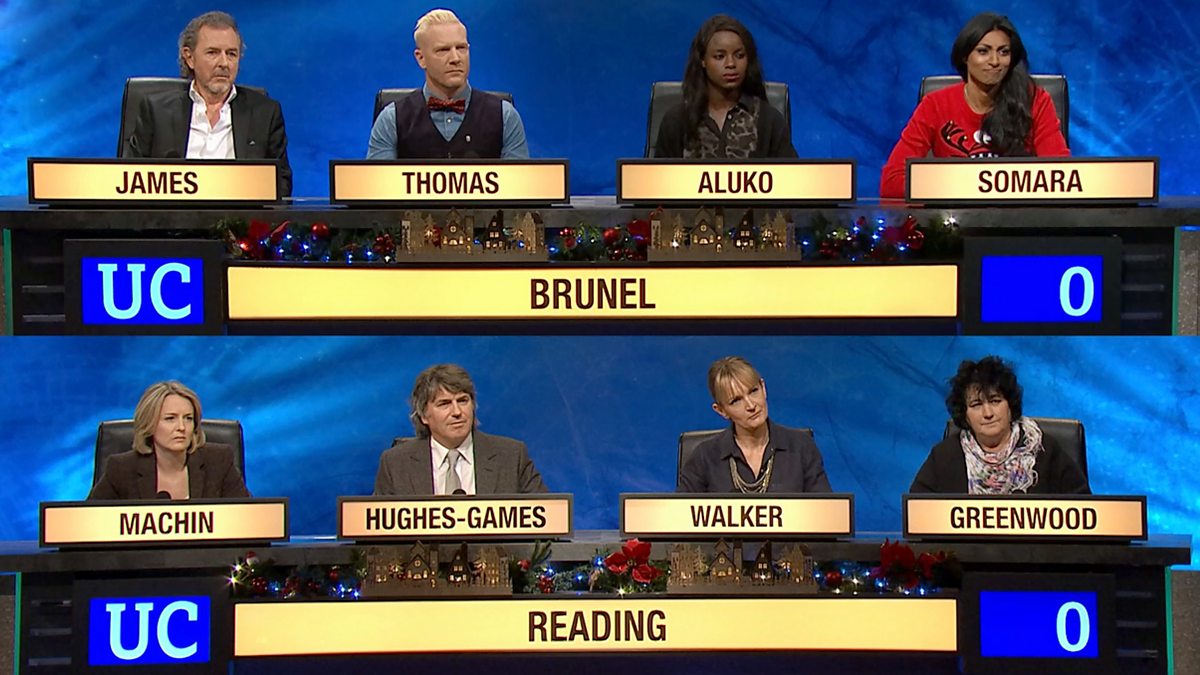 It is the last first-round match in the Christmas series for university alumni when two teams are up against each other for a place in the semis. Brunel University includes Chelsea footballer Eniola Aluko and former Olympian and broadcaster Iwan Thomas. Playing them is the Reading University team, with Springwatch presenter Martin Hughes-Games and gardening expert Pippa Greenwood.