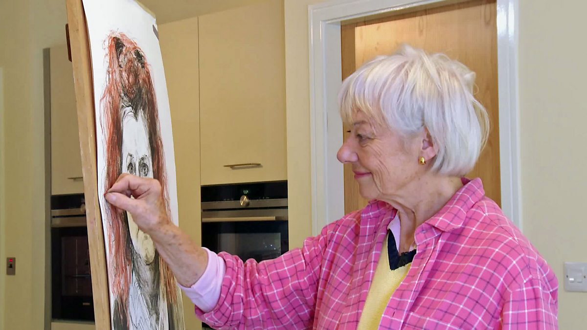 Fraoch Nic an Deòir a' dèanamh dealbh dubh is geal dhen chraoladair Catriona Nic a'Phì. Heather Dewar draws a charcoal portrait of broadcaster Catriona MacPhee.