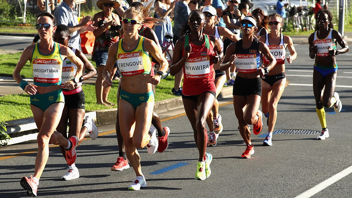 Continued live coverage of the marathons on the Gold Coast course, followed by rugby sevens semi-finals, the women's doubles squash final and netball bronze-medal match.