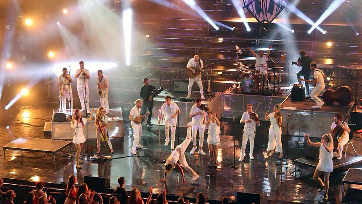 Gan wthio ffiniau cerddoriaeth Gymreig, dyma Pendevig ym Mhafiliwn Eisteddfod Caerdydd. Pendevig's performance on the stage of the Pavilion at the National Eisteddfod in Cardiff.