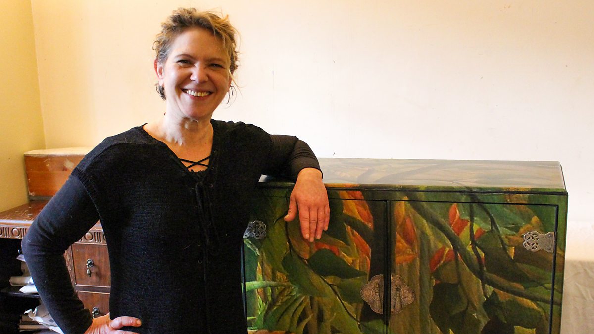 Junk makeover show. At the recycling centre in Woking, upcycler EJ Osborne rescues an old bedroom cabinet, an old metal box and a box of wooden blocks.