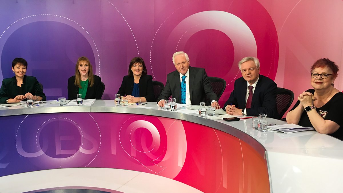 David Dimbleby chairs the debate from Southwark in south London. On the panel are former Brexit secretary, former Europe minister and Conservative Party chairman David Davis MP, shadow education secretary Angela Rayner MP, former secretary of state for education and current chair of the treasury select committee Nicky Morgan MP, former co-leader of the Green Party and the party's only MP Caroline Lucas, and comedian, writer and broadcaster Jo Brand.
