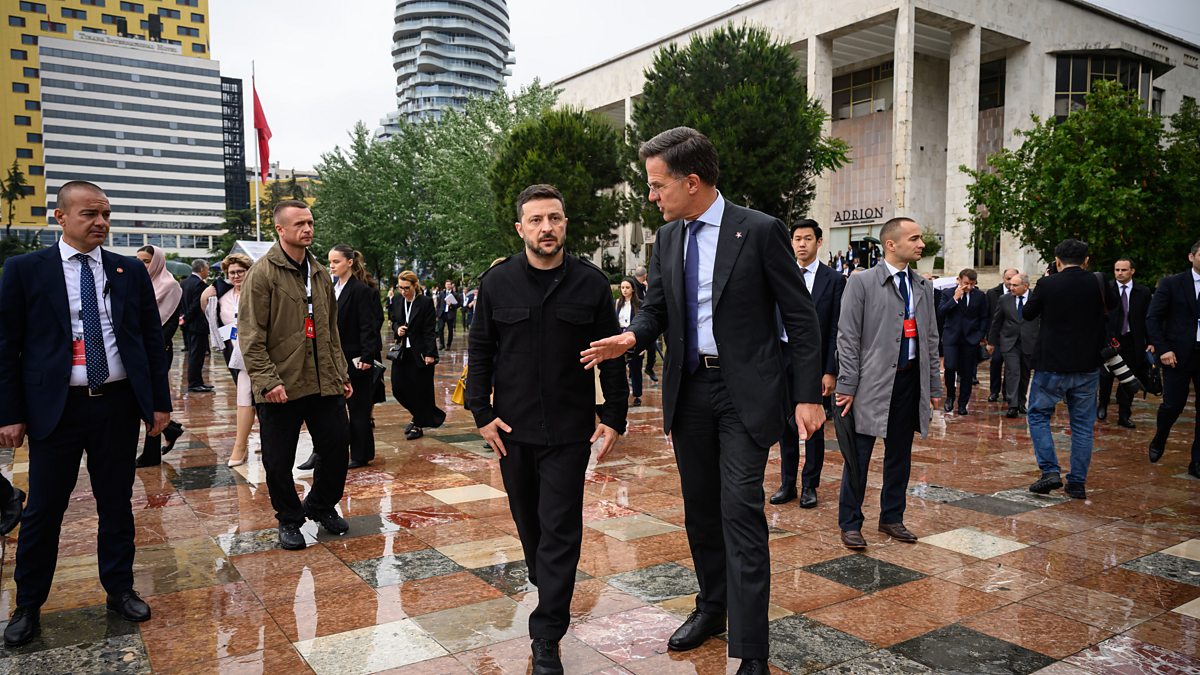 Ukraine President Volodymyr Zelensky, Nato Secretary General Mark Rutte and other leaders speak at a press conference after Nato's meeting in Vilnius.