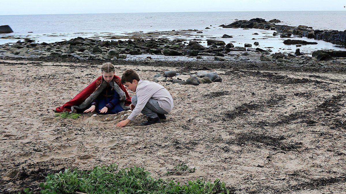 Tha Gudrun ‘s a caraid Olaf a’ dèanamh caisteal do phartan. Gudrun and her friend Olaf build a sandcastle for the shore crab.