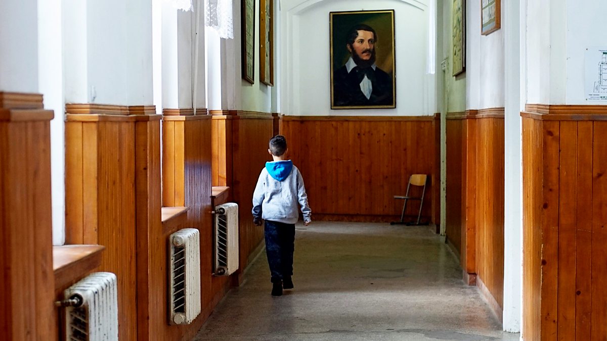 (Image: Pupil at a Hungarian-language secondary school in Berehove in Western Ukraine walks down a corridor bearing a portrait of Lajos Kossuth, the 19th Century political reformer after whom the school is named. Credit: Balint Bardi)