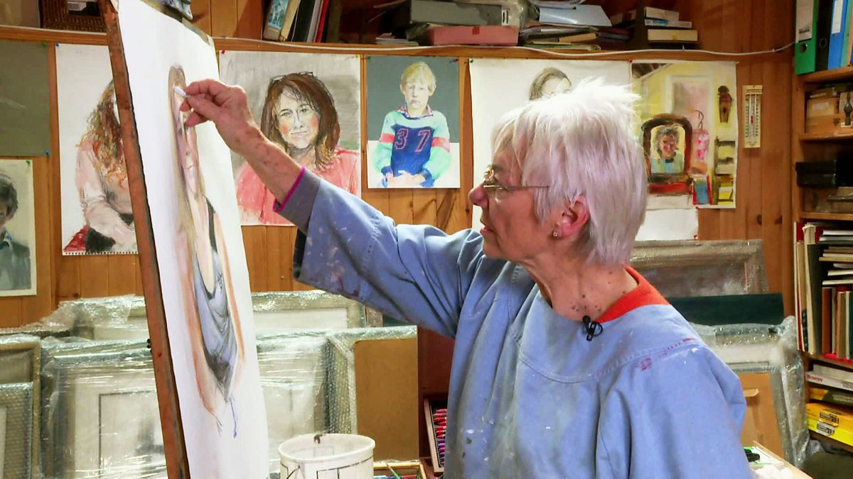 Heather Dewar draws a colour portrait of Ishi MacLean from Barra. Tha Fraoch Nic an Deòir a’dèanamh dealbh dhathte de dh’Ishi NicIlleathain a Barraigh.