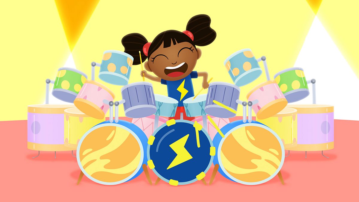 Dee encourages a friend to say ‘drum’, and we go on a whirlwind word adventure. We see and hear lots of different drums – a loud drum, a marching drum, a tap it drum and a whack it drum! We all have a dance to a steel drum, see a tiny mouse playing a rum pum drum and enjoy Dee playing a set of drums at a big concert.