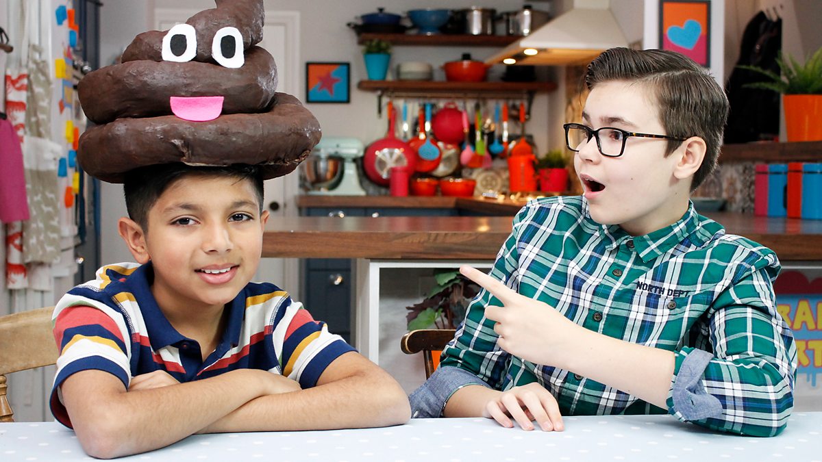 Ethan and Stanley create an emoji poop hat, while Georgia and Cara make some cheeky monkey flapjack snacks.