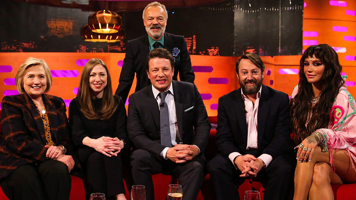 Together on Graham’s sofa tonight: Hillary Clinton and her daughter Chelsea, co-authors of The Book of Gutsy Women; superstar chef and campaigner Jamie Oliver, whose latest cookbook is Veg; and comedian and actor David Mitchell, talking about his collection of satirical columns, Dishonesty is the Second-Best Policy. With music from Kesha, who performs her current single Raising Hell.