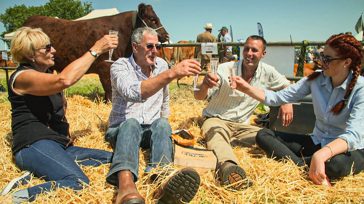 Young couple Darren and Emma are braving their first cattle show with their precious ruby red Poppy in the hope of taking home a red rosette but first they have to beat seasoned cattle breeders Grania and Simon at their local Launceston Show.