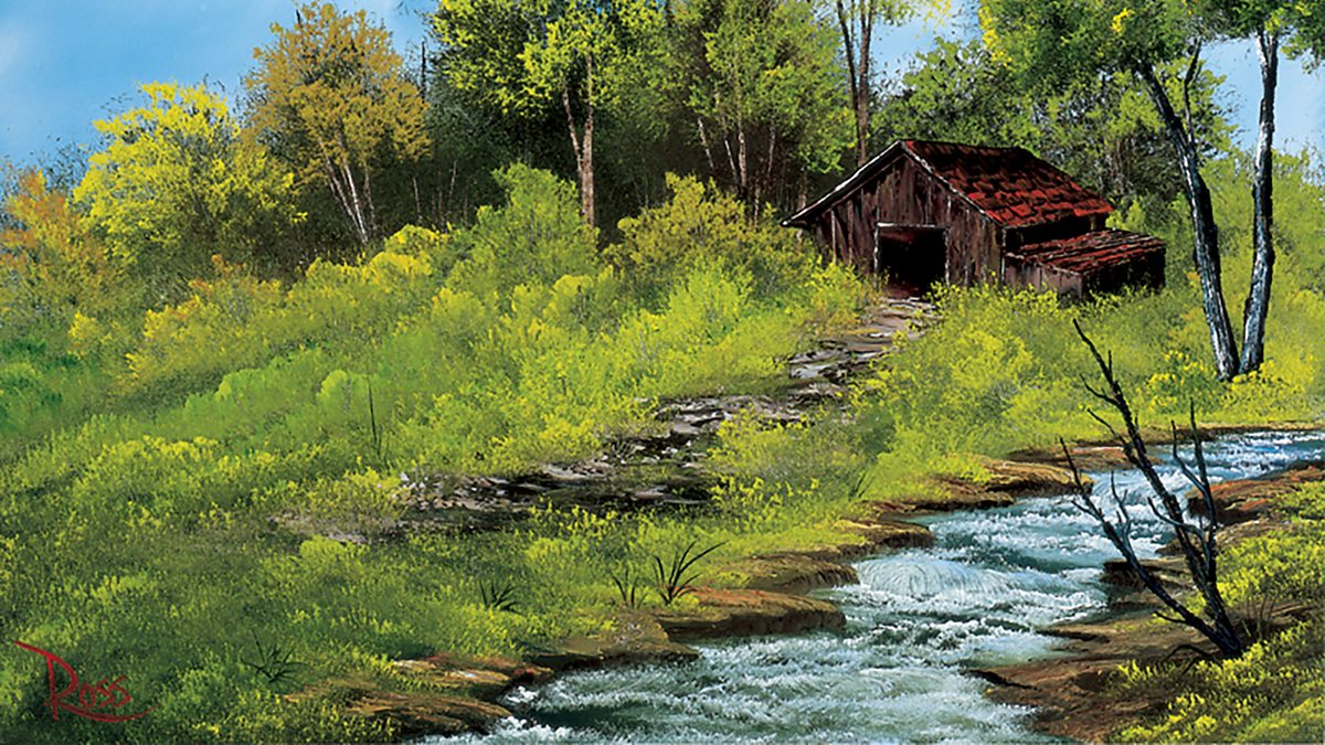 Bob Ross paints a beautiful summer scene, with a rushing little rivulet flowing through the luscious greenery of a cabin landscape.