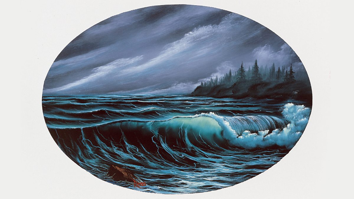 Bob Ross’s dramatic use of blue tones results in an emotional depiction of crashing night-time waves – all tucked inside an oval.