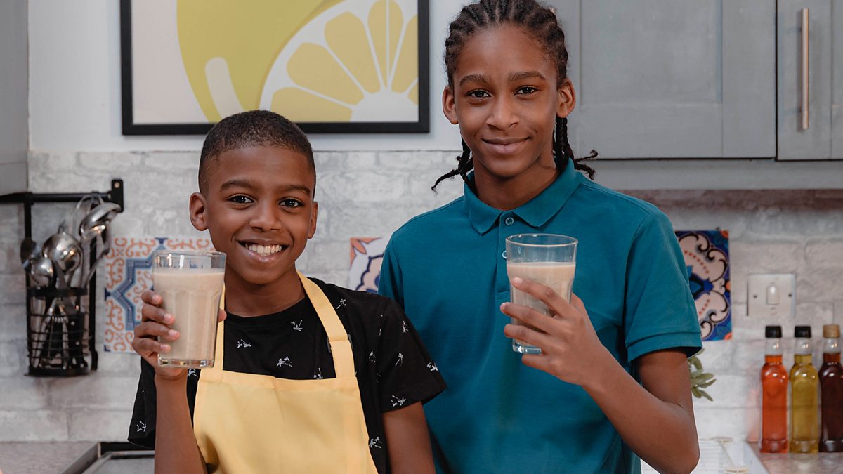 Chef Omari and his brother Laquarn are making Omari’s yummy Banana Shake Breakfast Shaky Shake Shake. This delicious breakfast is the perfect start for a busy day. They can drink it on the go, while looking sharp, and making plans for world domination.