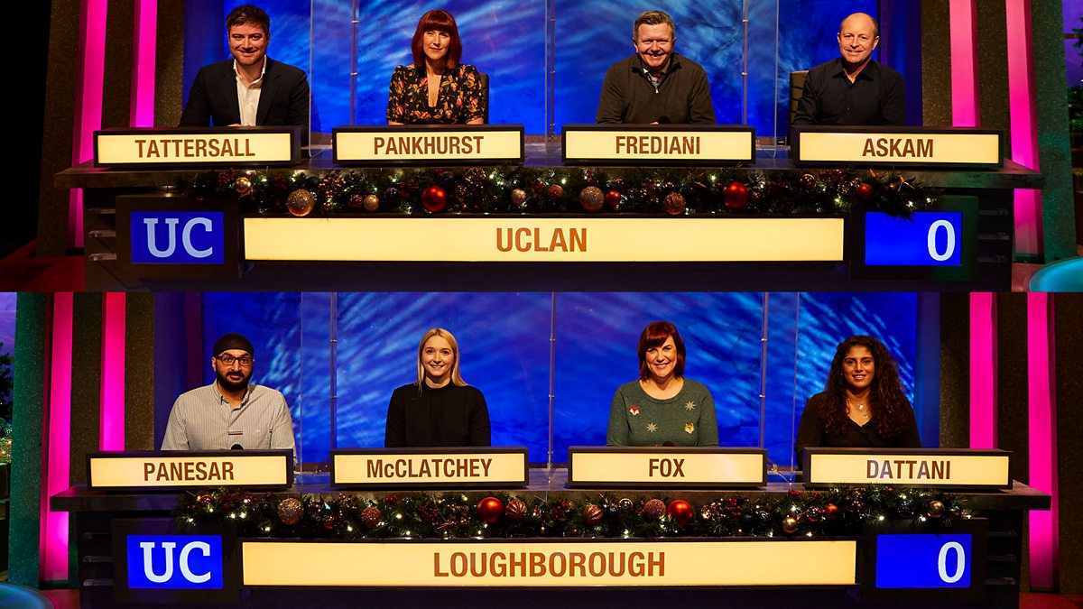 It’s match five of this special Christmas series for distinguished alumni, featuring the University of Central Lancashire against Loughborough University. Jeremy Paxman asks the questions.
