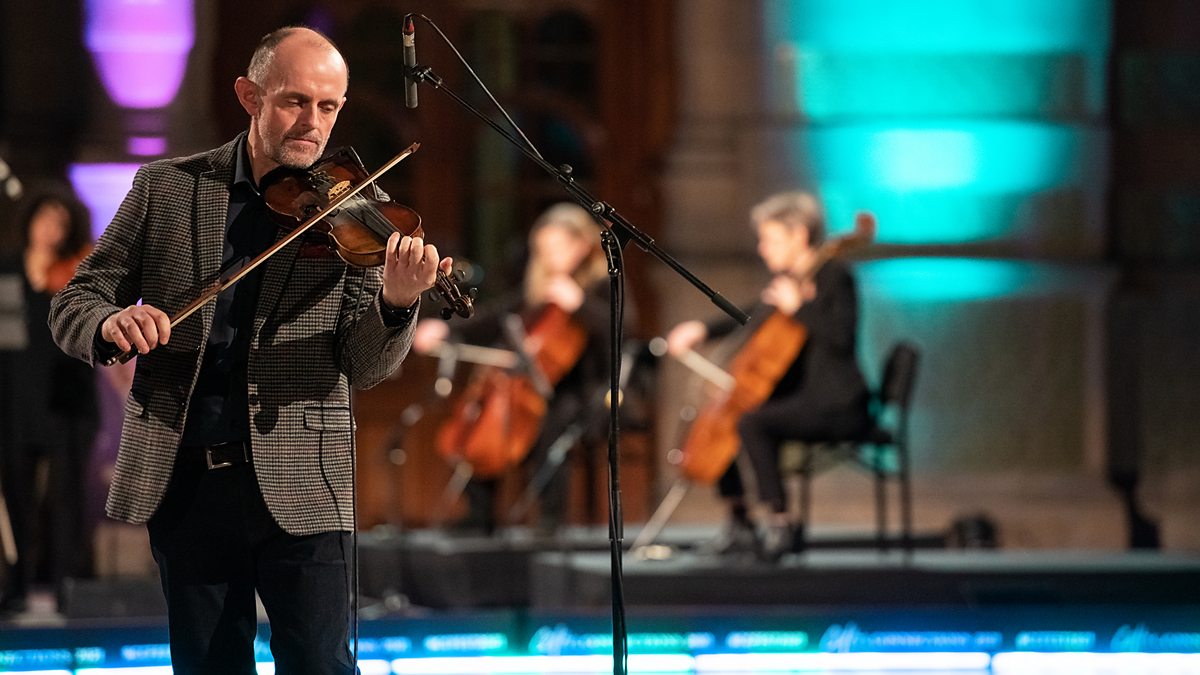Donnchadh Siosalach agus Co-cheòltairean na h-Alba aig Taigh-tasgaidh Kelvingrove. Duncan Chisholm and the Scottish Ensemble perform at Kelvingrove Museum and Art Gallery.