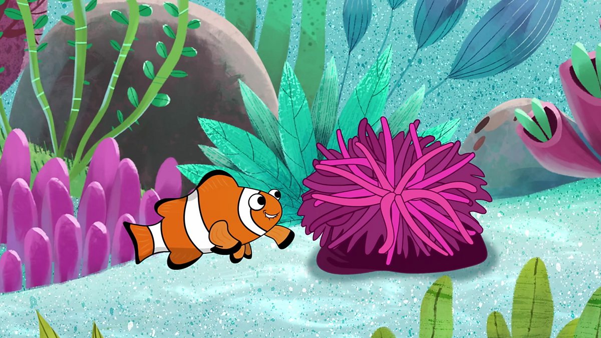The Clownfish tells us how they live on sea anemone which they keep clean, and how anemone in turn keep Clownfish safe from predators.