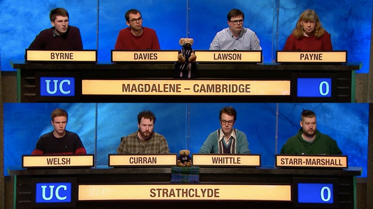 It’s the last of the quarter finals, with two more teams doing battle to reach the next stage of the student quiz. Jeremy Paxman asks the questions.