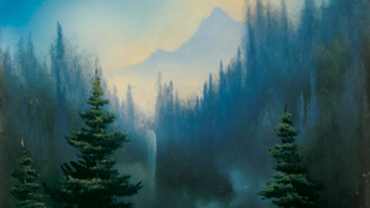 A partially blackened canvas is all you need to create this dark, mood-filled, misty waterfall scene with artist Bob Ross.