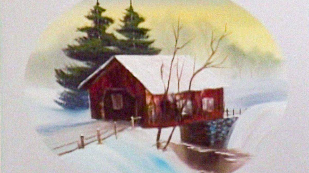 Cross a frozen stream under the shelter of a grand, covered bridge and enjoy the tranquillity of a beautiful winter’s day, all created by the magic of painter Bob Ross.