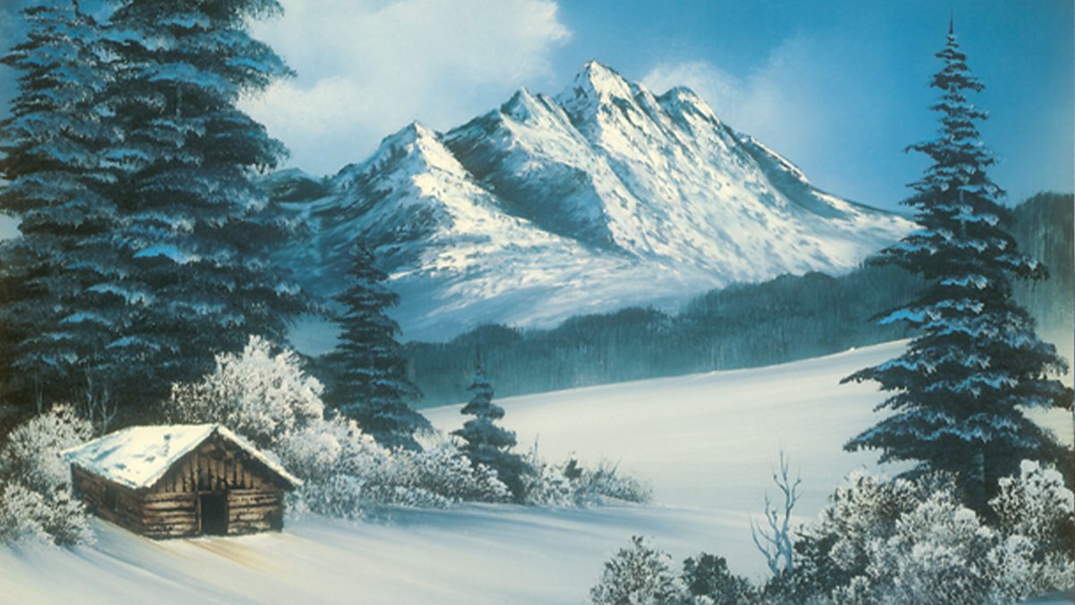 Travel to the mountains of the north with Bob Ross and marvel at the sight of a quaint cabin nestled into a lovely winter landscape.