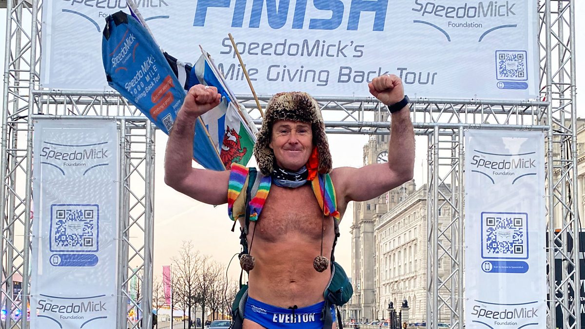 A man from Liverpool walks 2,500 miles around Britain in a pair of swimming trunks to give back to the charities who helped him through his battle with addiction and homelessness.