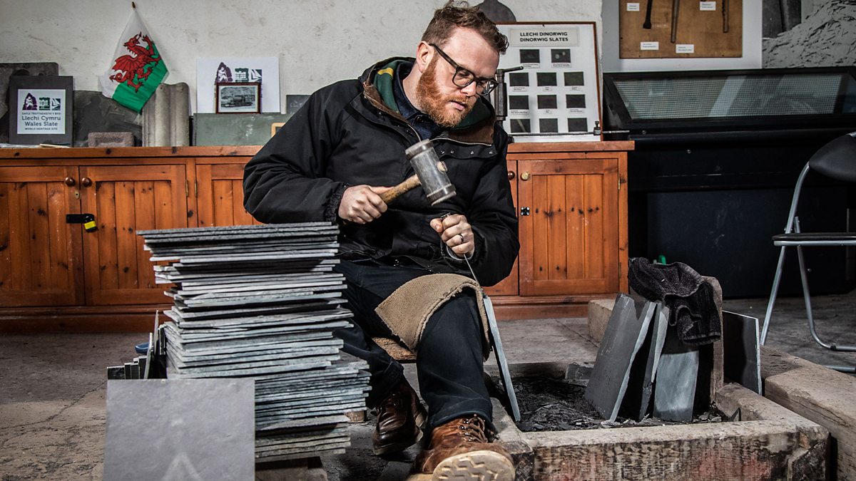 Huw meets Andrew ‘JonJo’, a sixth-generation quarryman who himself worked for 32 years at the Penrhyn quarry in Bethesda. Now he is a demonstrator, showing visitors the fine craft of slate splitting. He explains why, despite life as a quarryman being tough, he is proud of his heritage and how there was real camaraderie among the men. At its height in the late 19th century, the Welsh slate industry employed 14,000 men and produced nearly half a million tons of slate per year. Welsh slate was exported across the British Empire and beyond, and is still considered some of the best in the world.