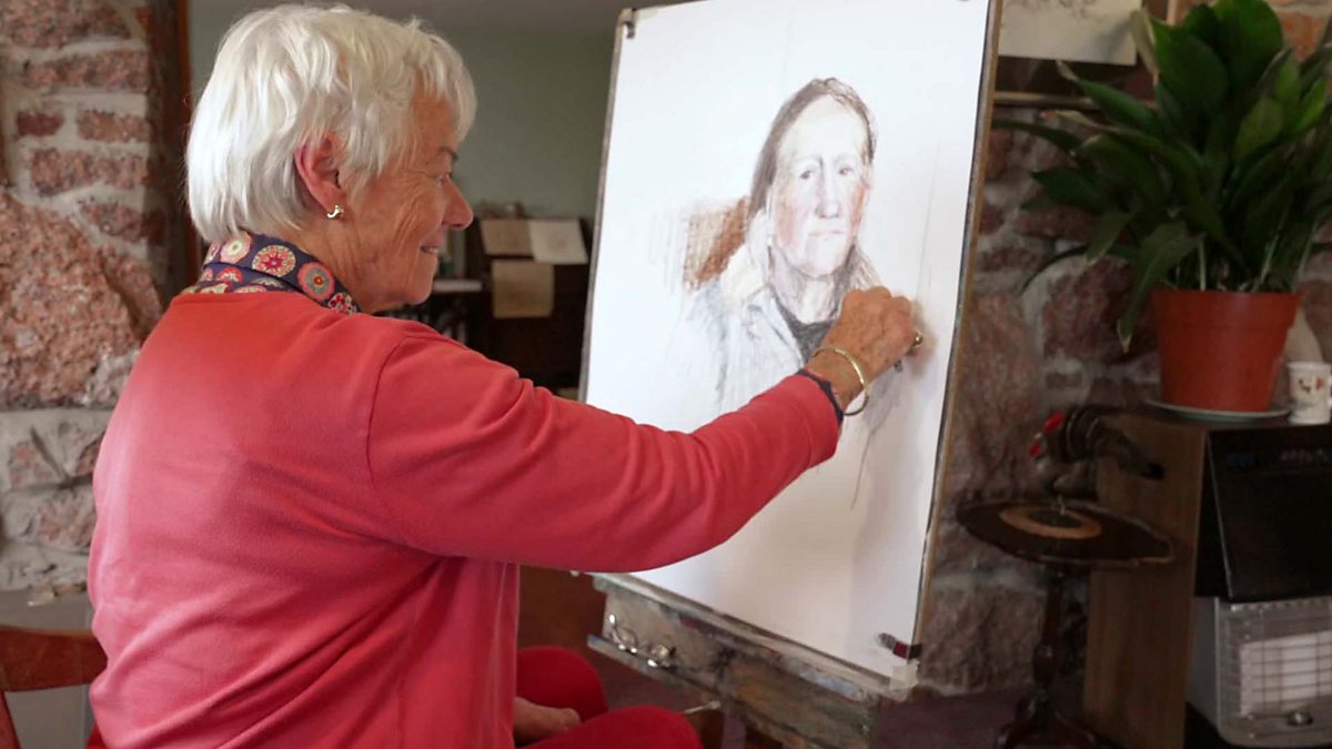 Heather Dewar visits Mull where she draws a colour portrait of Eleanor MacDougall. Tha Fraoch Nic an Deòir ann am Muile a’dèanamh dealbh dathte de Eleanor NicDhùghaill.
